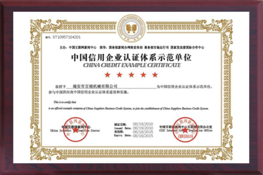 Unser menschenorientiertes Unternehmen verfolgt das Ziel, durch Qualität zu bestehen, durch Innovation zu entwickeln und durch Integrität auf dem Markt erfolgreich zu sein. Wir verfügen über eigenständige F\&E-Fähigkeiten, hochentwickelte Bearbeitungsanlagen und setzen moderne Technologien ein, kombiniert mit wissenschaftlichem Management, umfassenden Prüfmethoden und einem vollständigen Qualitätssicherungssystem. Im Jahr 2010 wurde die Ruian Baixiao Machinery Co., Ltd. vom China Internet News Center (unter Schirmherrschaft des China Internet Network Information Center und mit Anleitung des Network Publicity Bureau des State Council Information Office, der Market Operation Department des Ministeriums für Handel und des International Cooperation Center der National Development and Reform Commission) mit den Titeln „China Credit Enterprise Certification System Demonstration Unit“ und „China Credit Enterprise Unit“ ausgezeichnet.